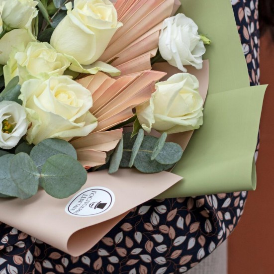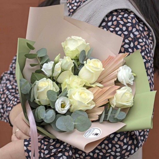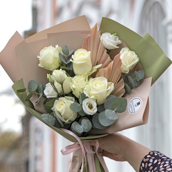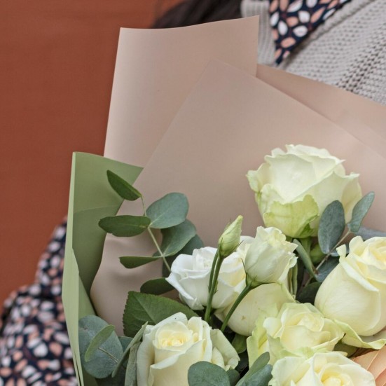 Букет из белых роз и эустомы