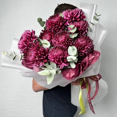 Выразительный моно букет из сезонной стойкой хризантемы "Бигуди" и эвкалипта